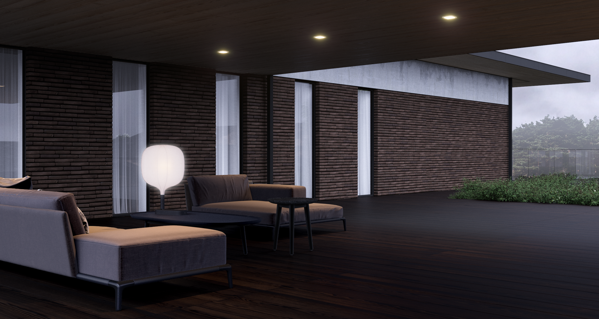 An open terrace overlooks the green area, allowing residents to enjoy the scenery. Outdoor furniture seems to be carved out of stone or made of concrete - very laconic, without unnecessary details.