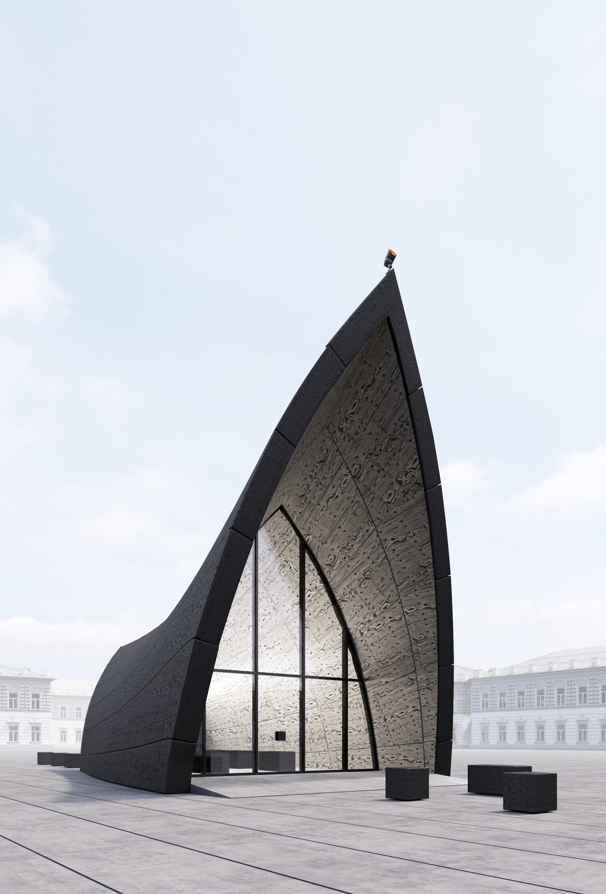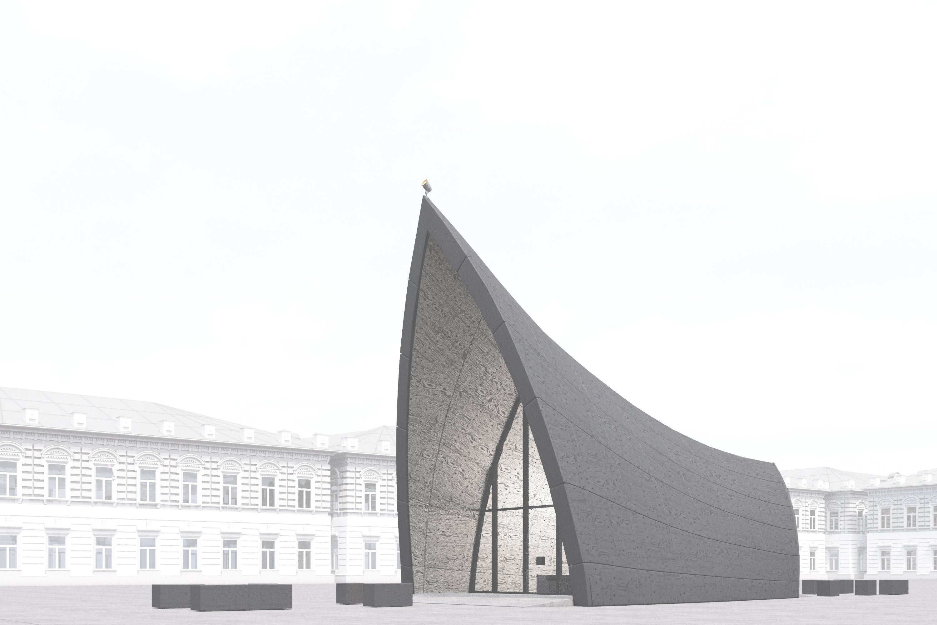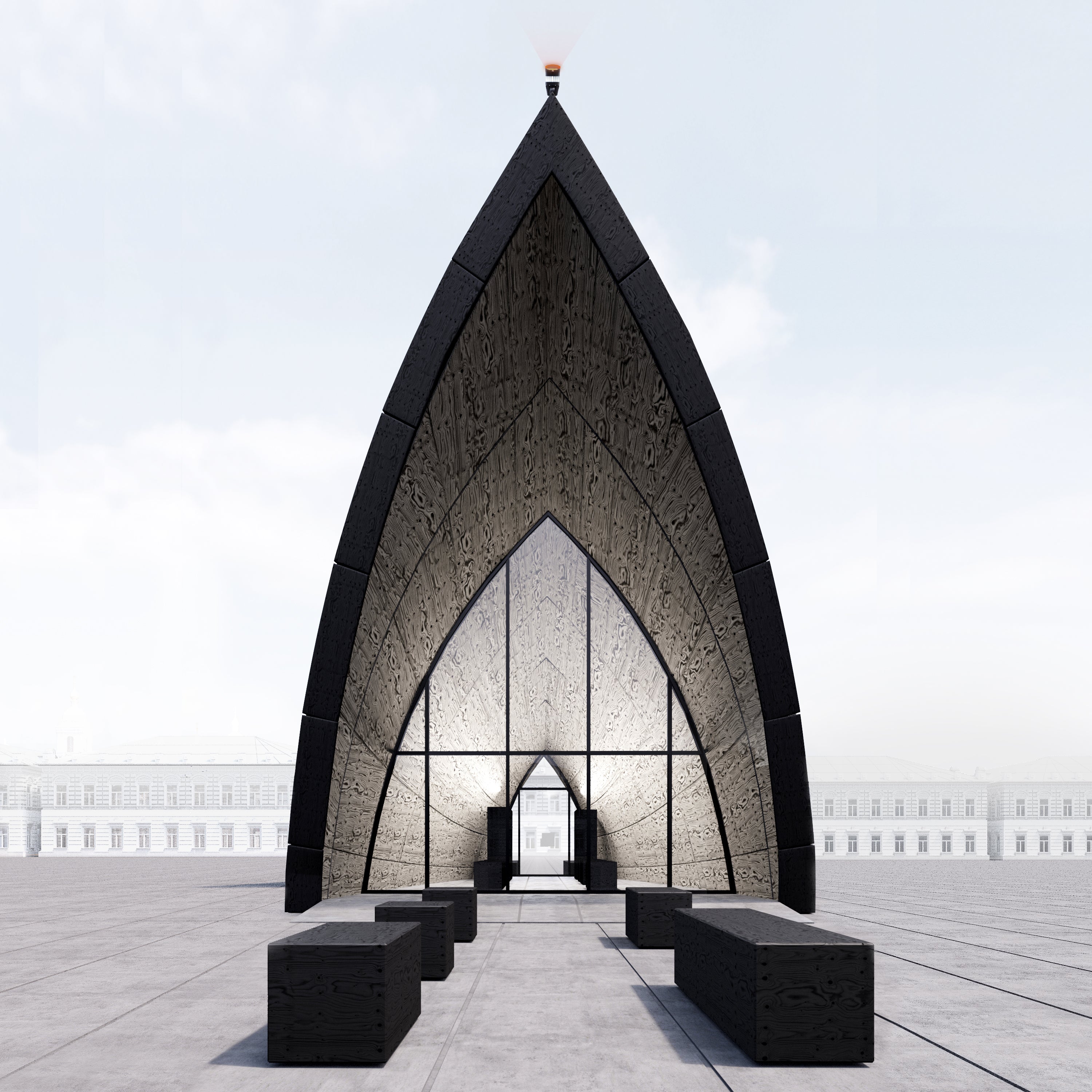 A mound is a high mound over an ancient burial ground, and the traditional attribute of a monument is fire. In our project, we combined both of these elements. The shape of the building is subconsciously associated with the shape of the mound, ravine. A street floodlight on the highest point of the roof symbolizes the eternal fire of memory for the dead.