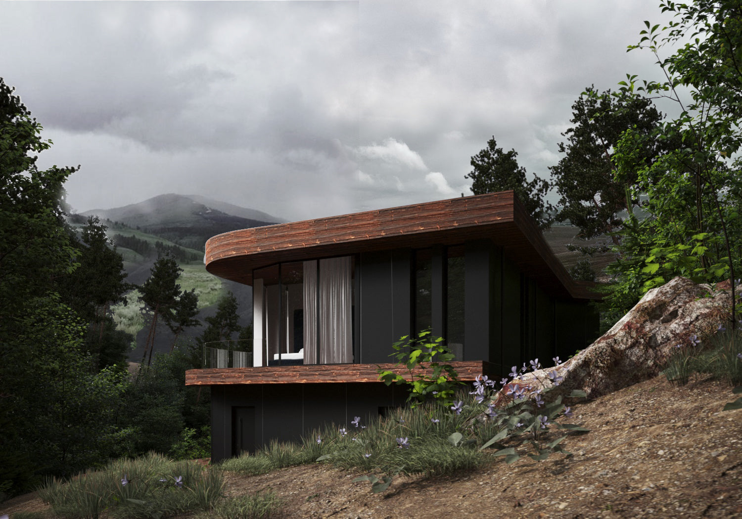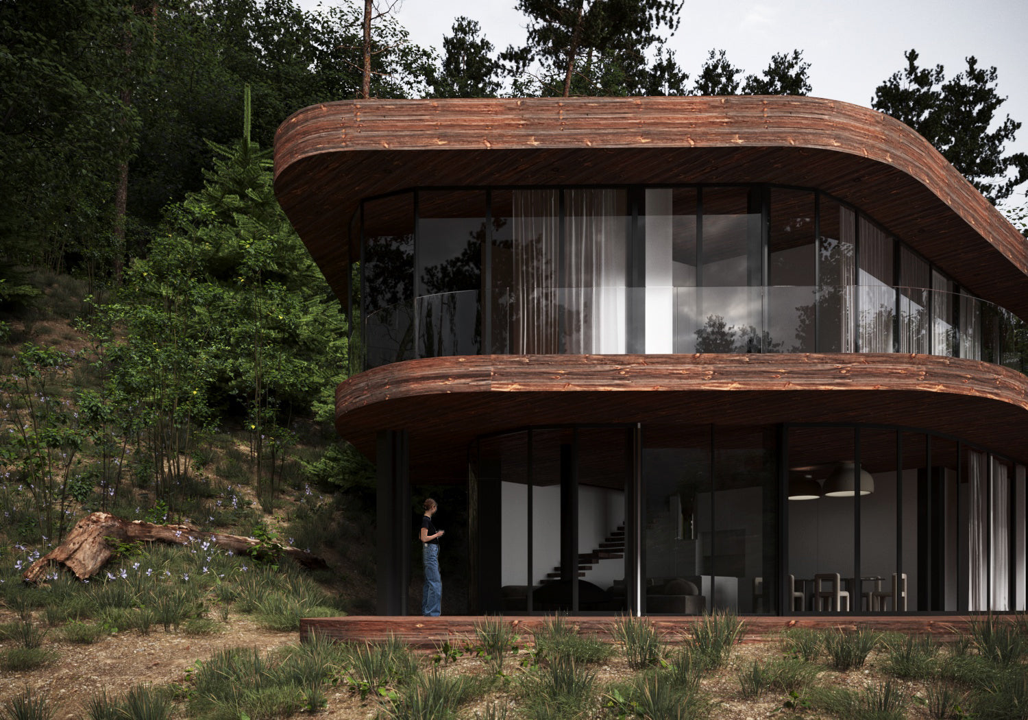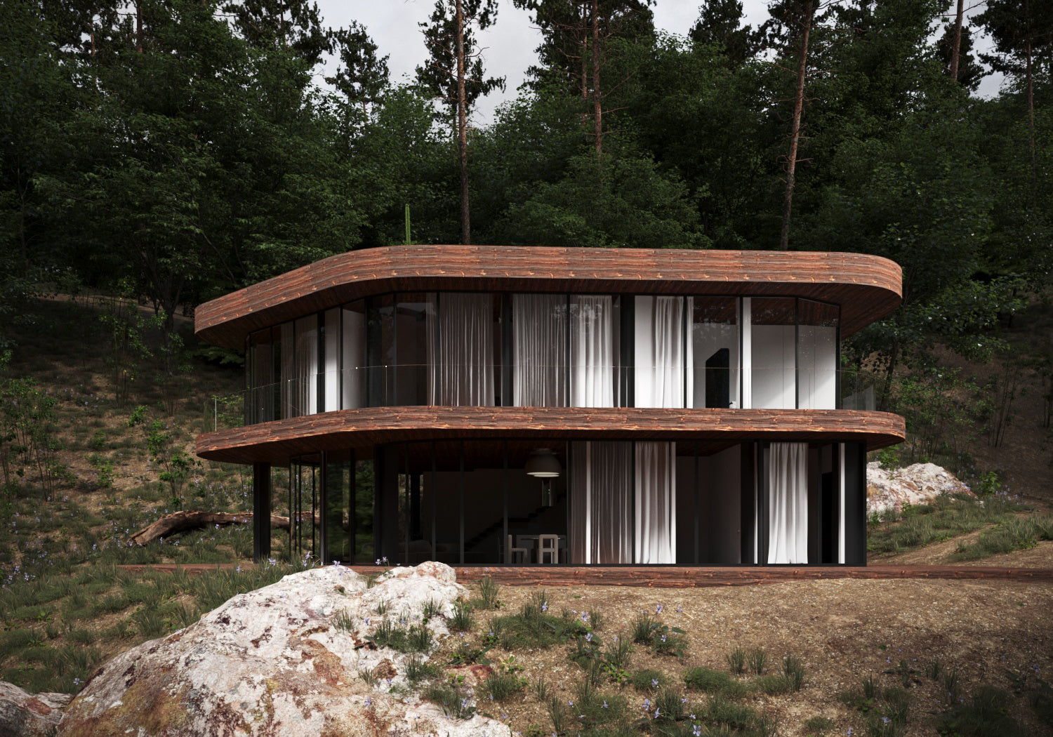 The concept was to make a harmonious house that reflects Yakusha's philosophy of 'live architecture and design' and blends into its natural environment. Located in a lowland, deep in the mountains, its panoramic windows embrace each ray of natural light that penetrates the surrounding mountains and spruce trees. The fully glass facade, interrupted only by levels of natural wood, highlighting each floor of the building, embraces sunshine and reflects the surrounding mountain forest. Panoramic glazing and terraces integrate the environment into the interior and vice versa. The roof of the home visually appears flat, to better compliment the shape of the building, but it is in fact with a slope — a functional solution for Carpathian winters.