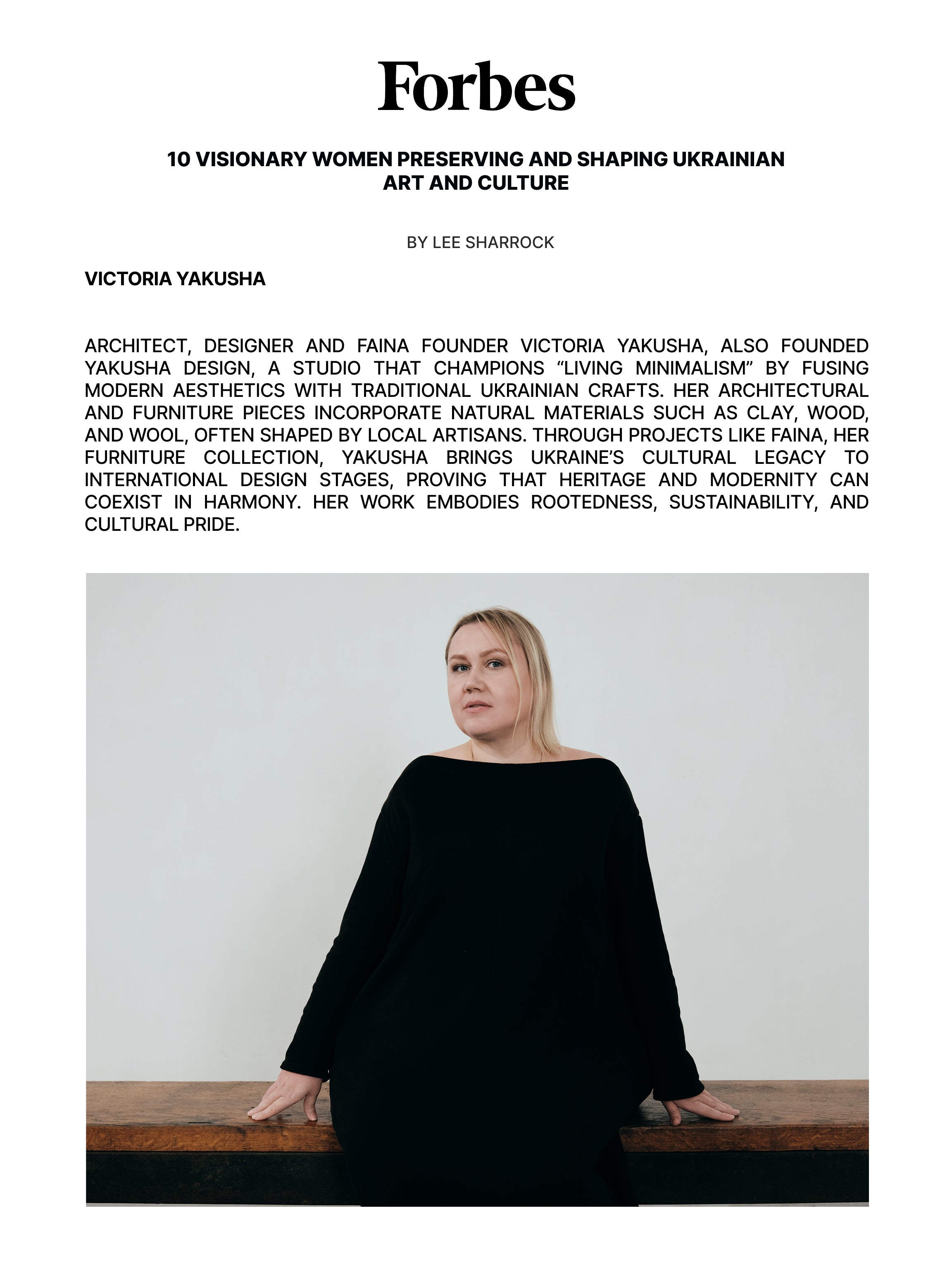 The founder of YAKUSHA and FAINA, she is the mastermind behind live minimalism, a cultural heritage architect, and a global ambassador of Ukrainian design.