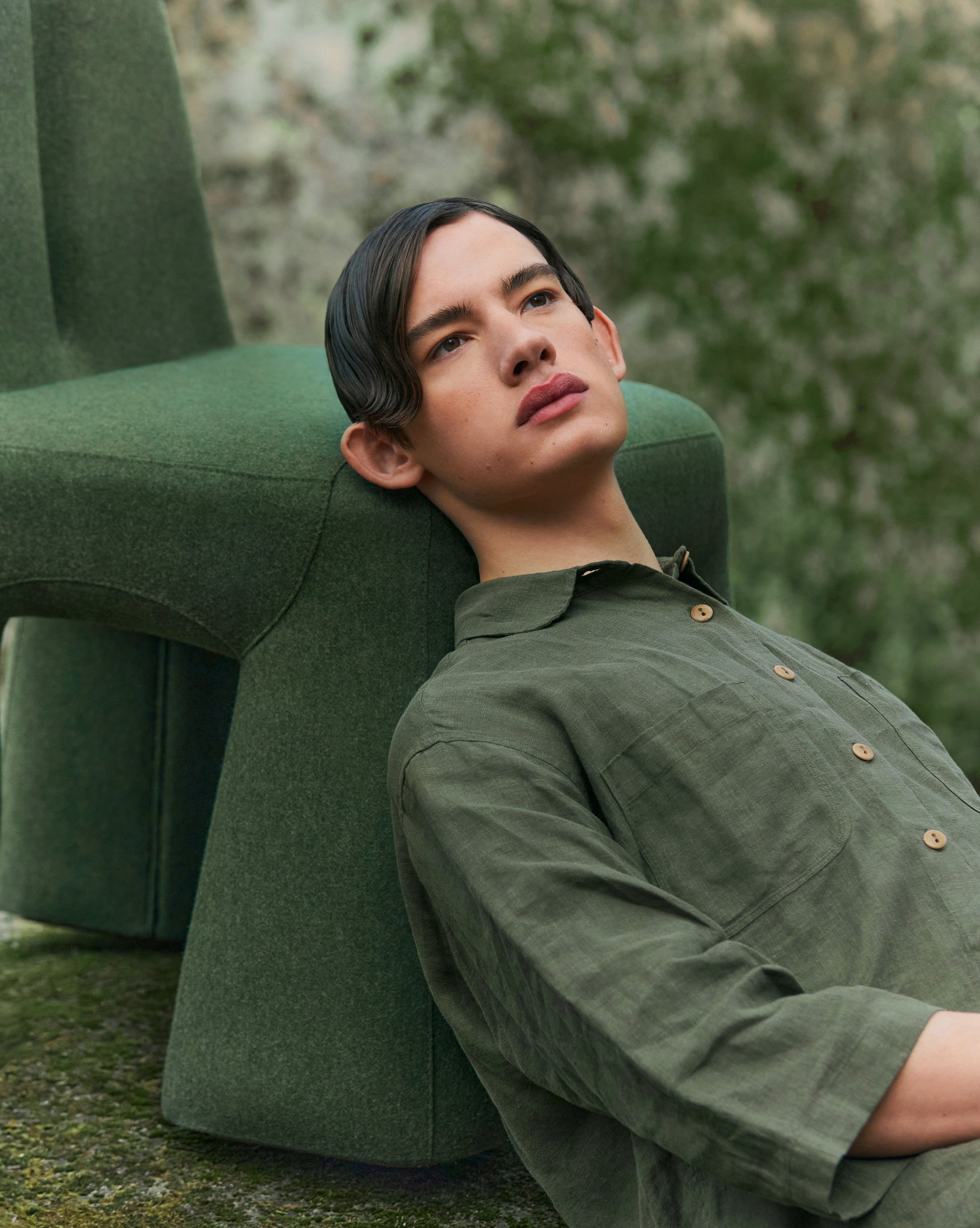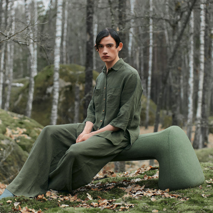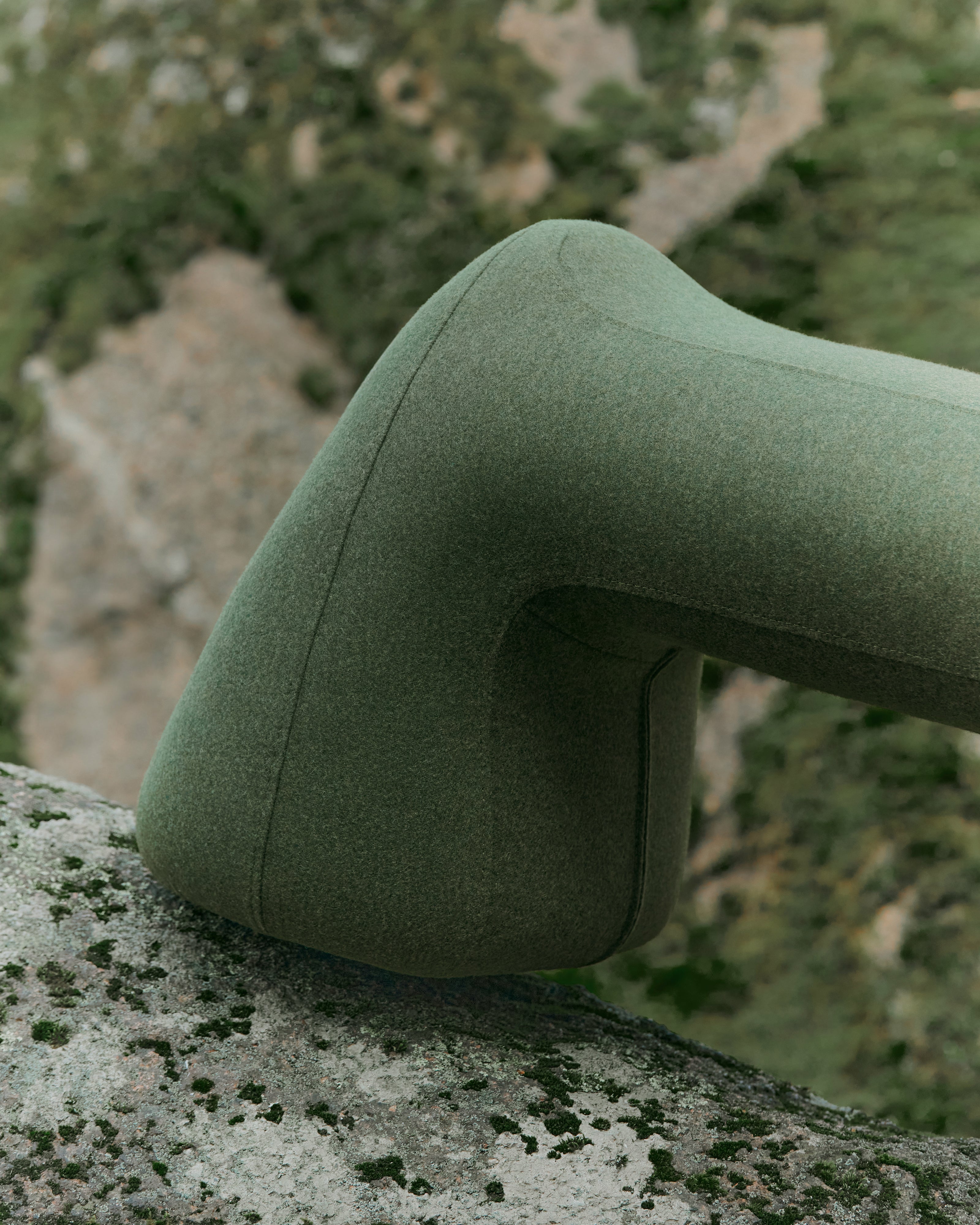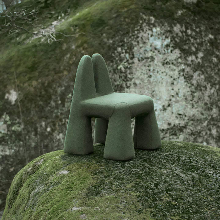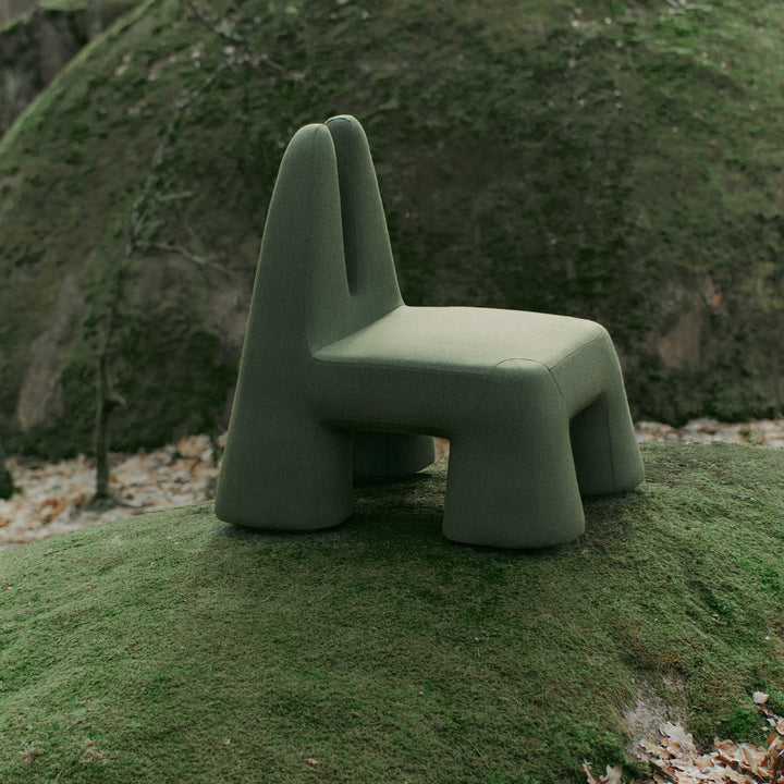 The Grun’ chair and armchair embody the spirit of animism in a single, captivating design. The dark green upholstery evokes the lush, moss-covered hills of the forest, enhancing its organic appeal. With a whimsical form reminiscent of a magical forest creature, these pieces feature elongated, ear-like accents that invite the imagination, drawing inspiration from the mysteries of nature. Its wide, solid base seems to draw energy from the earth and marshes, while the "antennae" reach upward, symbolizing a connection to the sky and the future. Sitting within, you find yourself cradled between the wisdom of the past and the inspiration of the future, enveloped by a sense of energy that feels almost alive.