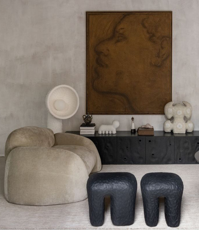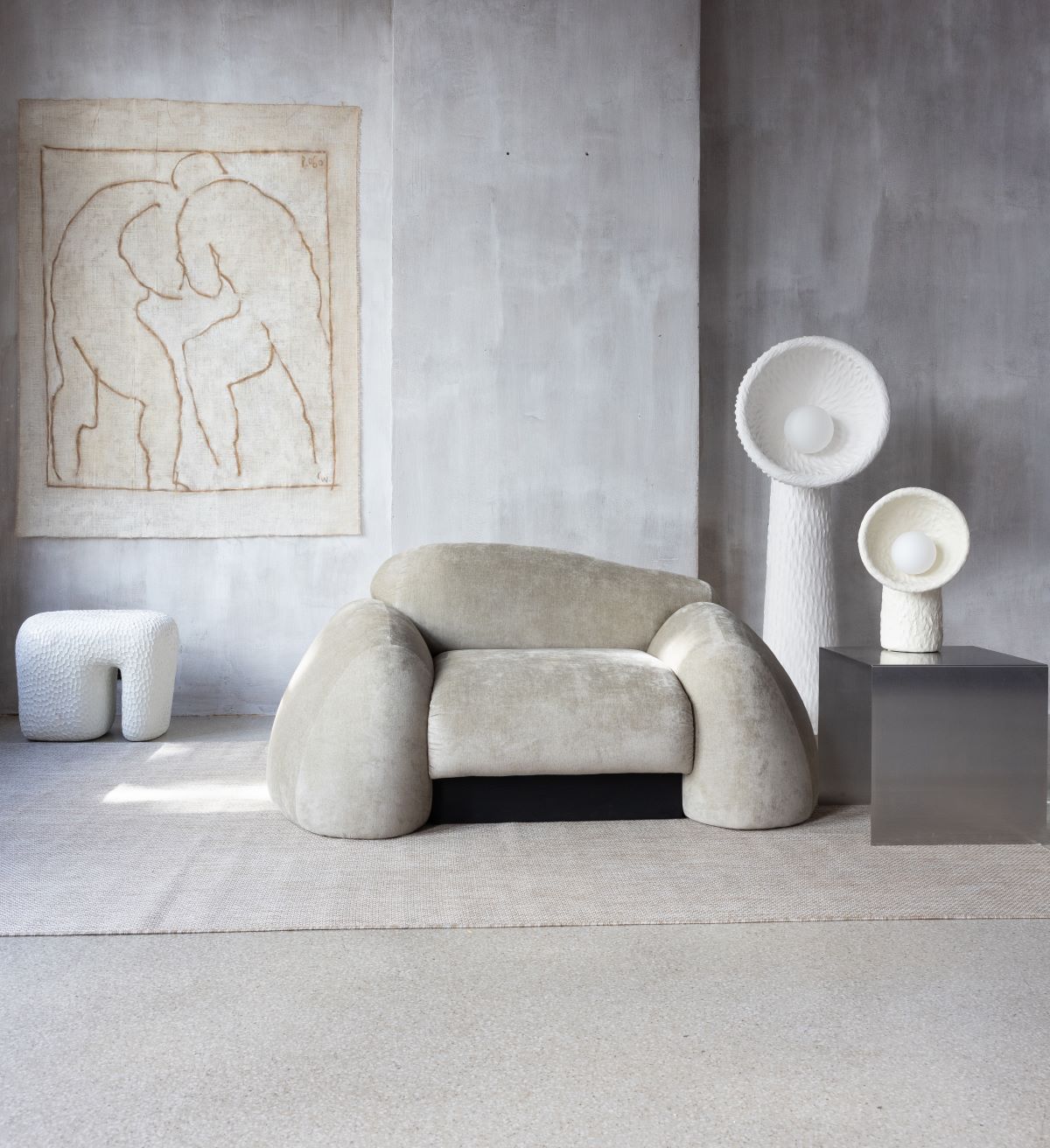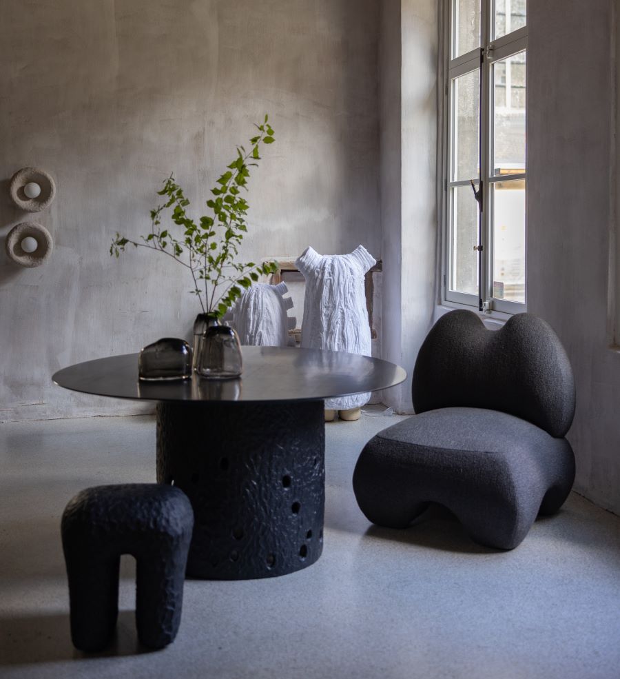 The echoes of the ancient glass blowing techniques are mastered in crafting the water droplet resembling PLYN vases which complement the charm of DOMNA chair’s curvaceous shape. At the same time SLUHACH lamps delicately invoke the feeling of magic and further animism in the space.