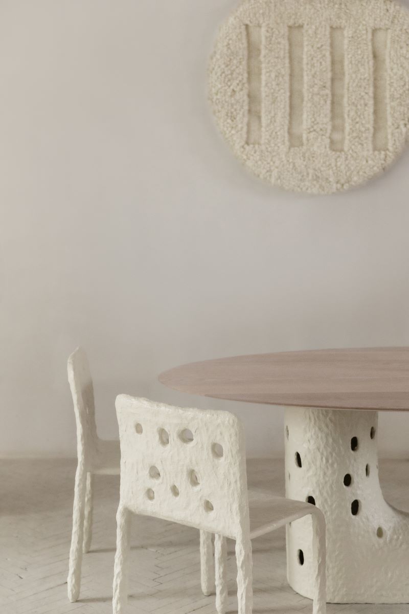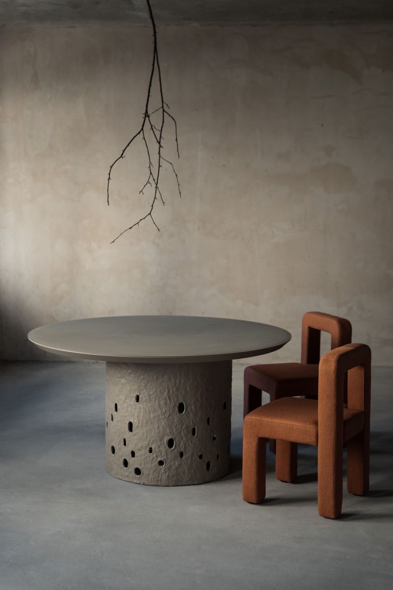 Victoria Yakusha’s ZTISTA collection is a tribute to warm, nostalgic memories of childhood, family, and the simple joys of handmade traditions. Every item in this collection – from sculptural tables to expressive chairs – is crafted using ZTISTA, a unique sustainable material developed by Yakusha. Its name derives from the Ukrainian word for “made from dough,” reflecting both the texture and the artisanal process behind the pieces.